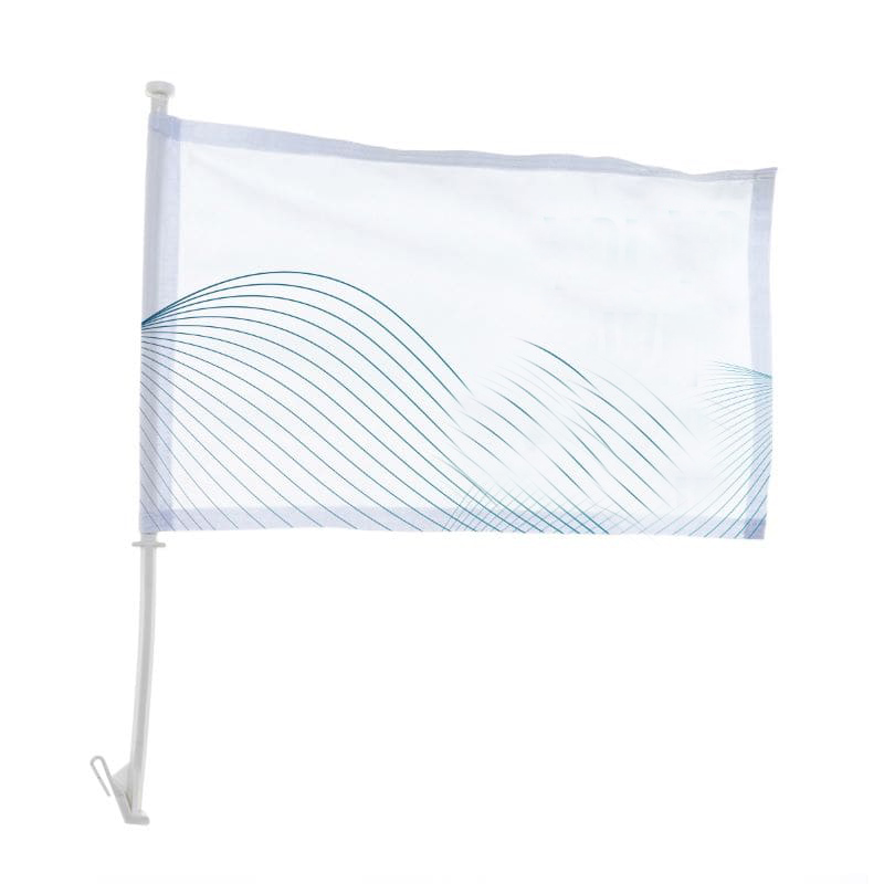 Le drapeau personnalisé est livré avec une hampe en plastique blanc d’un diamètre de 1,2 cm et d’une longueur d’environ 50 cm. Sa base spéciale permet une fixation rapide et fiable sur les fenêtres des véhicules :