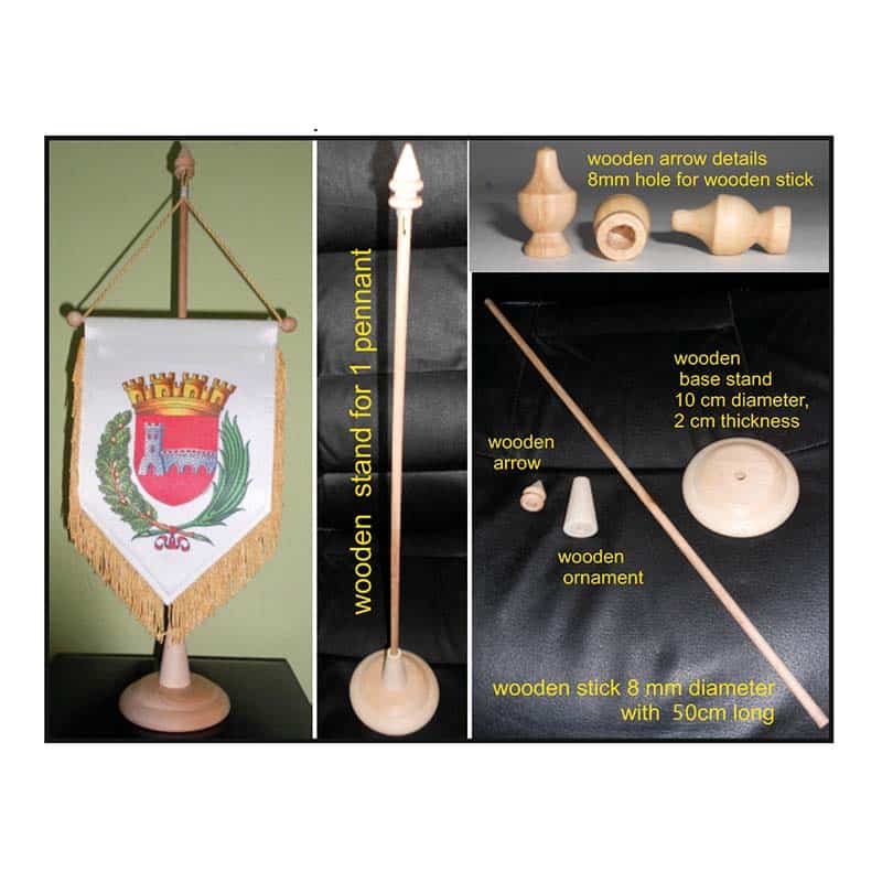 Caractéristiques techniques du socle en bois et des fanions personnalisés sur mesure :