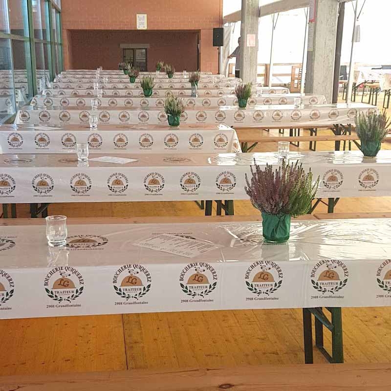 Nos nappes plastiques sont en PED d’épaisseur 50 microns et se présentent en rouleaux de différentes largeurs au choix. Bien sur si vous préférez les nappes en maille textile imprimées en sublimation , nous les proposons aussi.