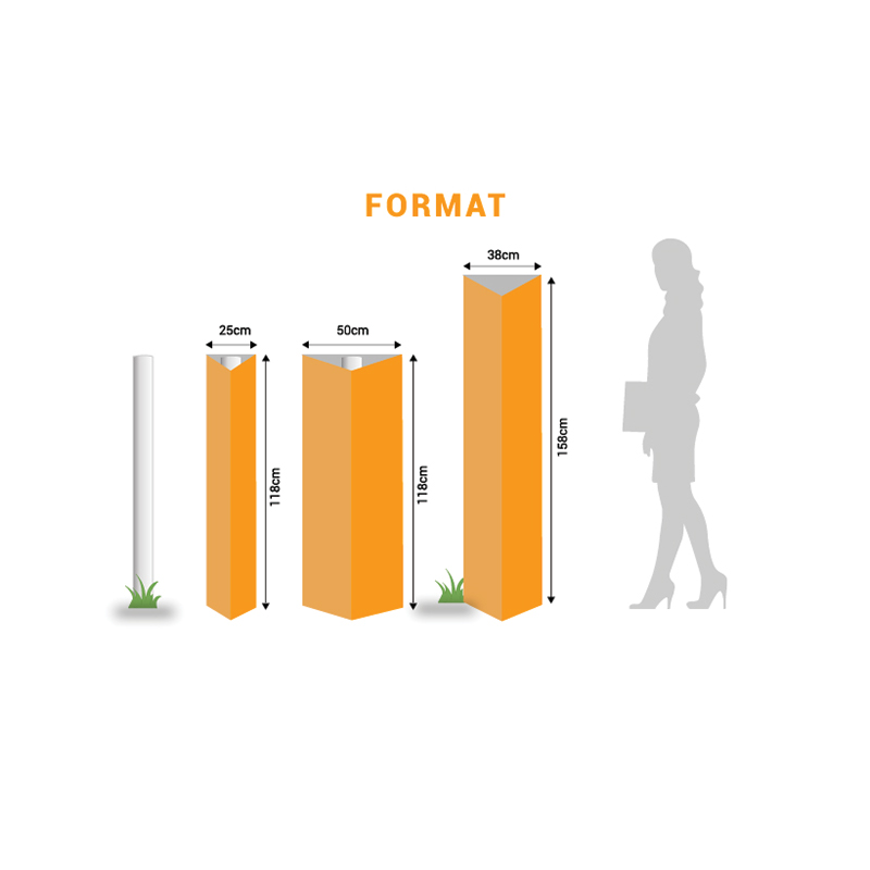 Le triptyque totem personnalisé est fourni replié, doté d’un système de double rainage qui facilite un assemblage simple et rapide. Avec les pattes de collage et les fixations fournies, son installation est simple autour d’un poteau ou en mode autoportant, sans avoir besoin d’outils sophistiqués ni de compétences techniques spécifiques.