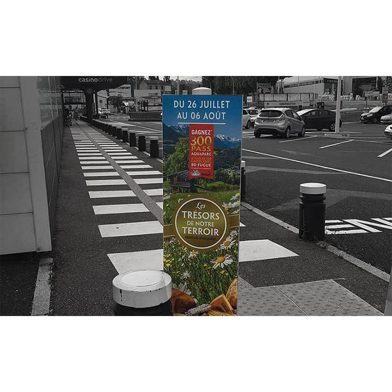 Ce totem publicitaire, doté de trois côtés imprimés en quadrichromie, assure une visibilité optimale de votre message sous tous les angles, ce qui en fait un outil particulièrement stratégique dans les zones à fort trafic. Il capte aisément l’attention et booste notablement la rétention de votre marque, même dans des lieux extrêmement bondés.
