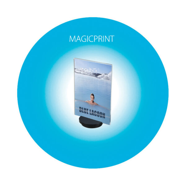 Le porte-menu pivotant Magicprint est fabriqué en acrylique coulé transparent de qualité premium, avec une épaisseur uniforme de 4 mm garantissant une solidité supérieure et une transparence cristalline. La base, en acrylique noir teinté dans la masse, mesure environ 10 mm d’épaisseur et intègre un mécanisme rotatif fluide permettant une rotation sur 360 degrés sans à-coups.