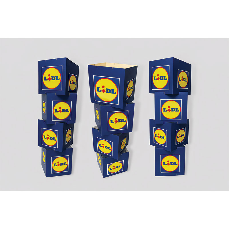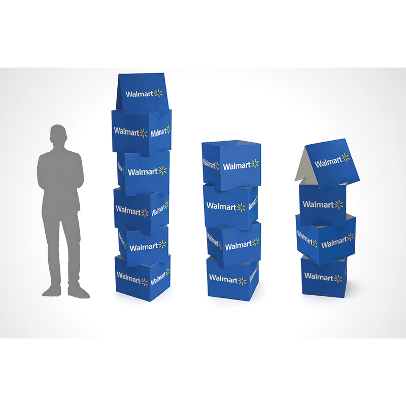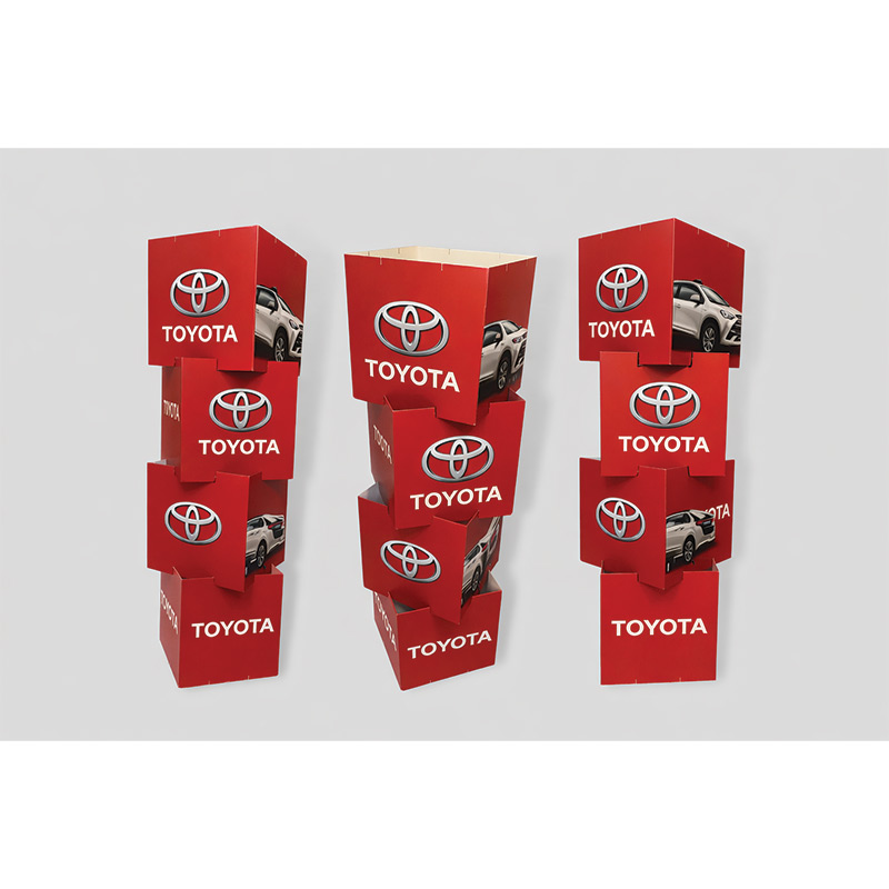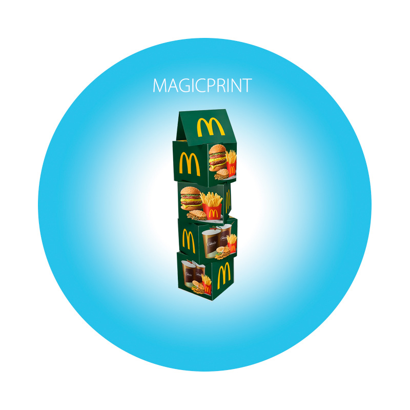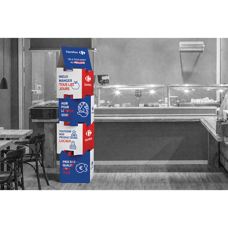 Le design basé sur des cubes superposés présente une présence visuelle marquée qui se distingue des supports classiques et permet d’utiliser plusieurs surfaces de communication en même temps. Chaque côté se transforme en un espace stratégique pour présenter vos images, vos promotions ou votre marque, ce qui améliore la rétention de l’information et amplifie considérablement l’effet de votre campagne en point de vente.